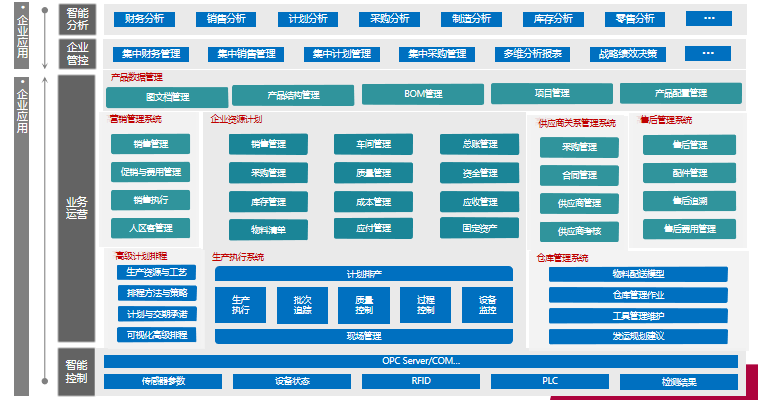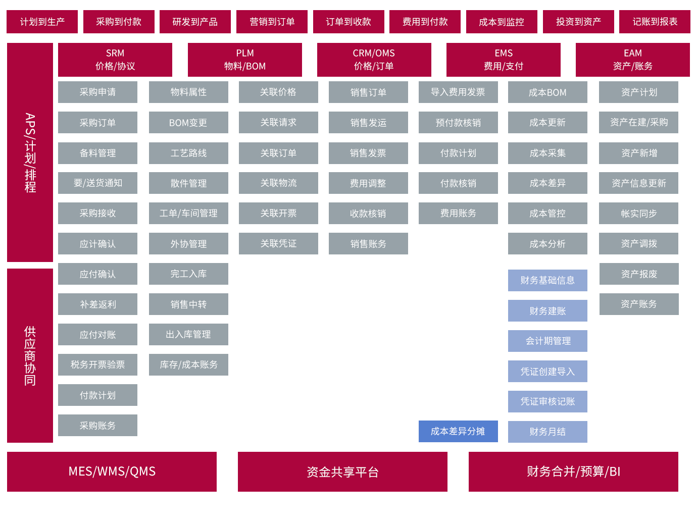 企业ERP实施实现包括从研发到产品、市场到订单、计划、生产,采购到付款、生产到成本管控、销售到收款、投资到资产、记账到报表的端到端的全业务价值链的流程拉通与提升,实现企业物流、信息流、资金流、单据流、审批流的高度集成统一。实现ERP与各业务系统的无缝集成,形成业务流程的闭环。不仅规避了企业整体业务流程的重叠、断点、遗漏,更是提升了企业整个业务链、价值链的效率和风险管控。满足企业中高层管理的信息化管控需求,为企业数字化运营打下了坚实的基础。